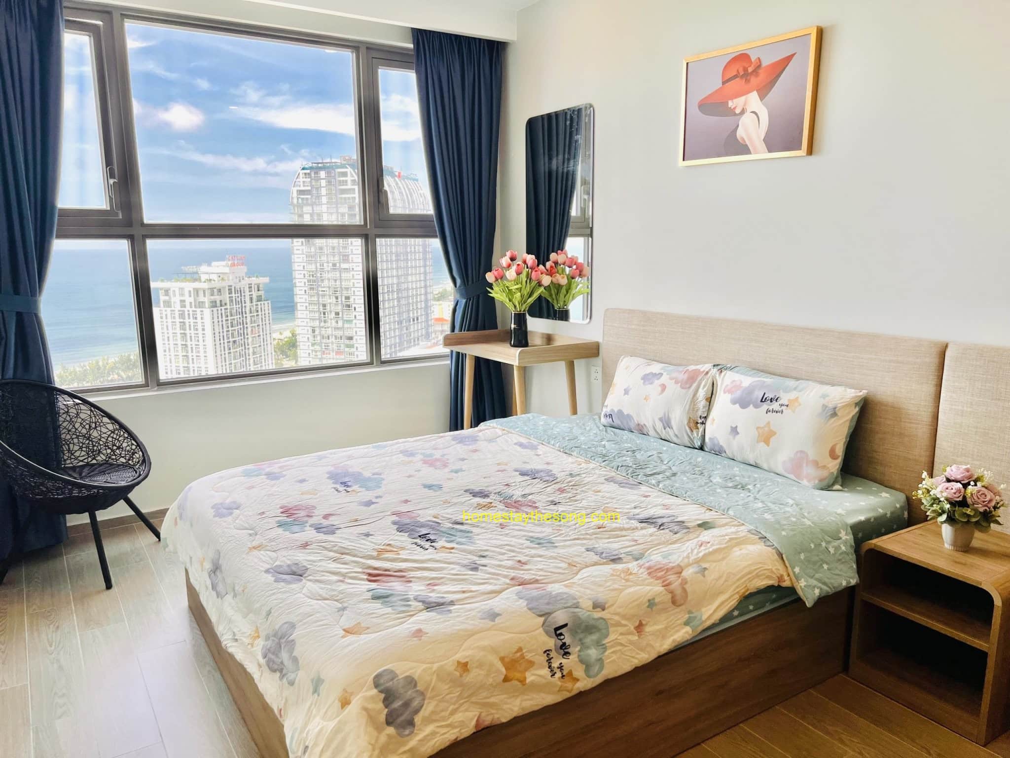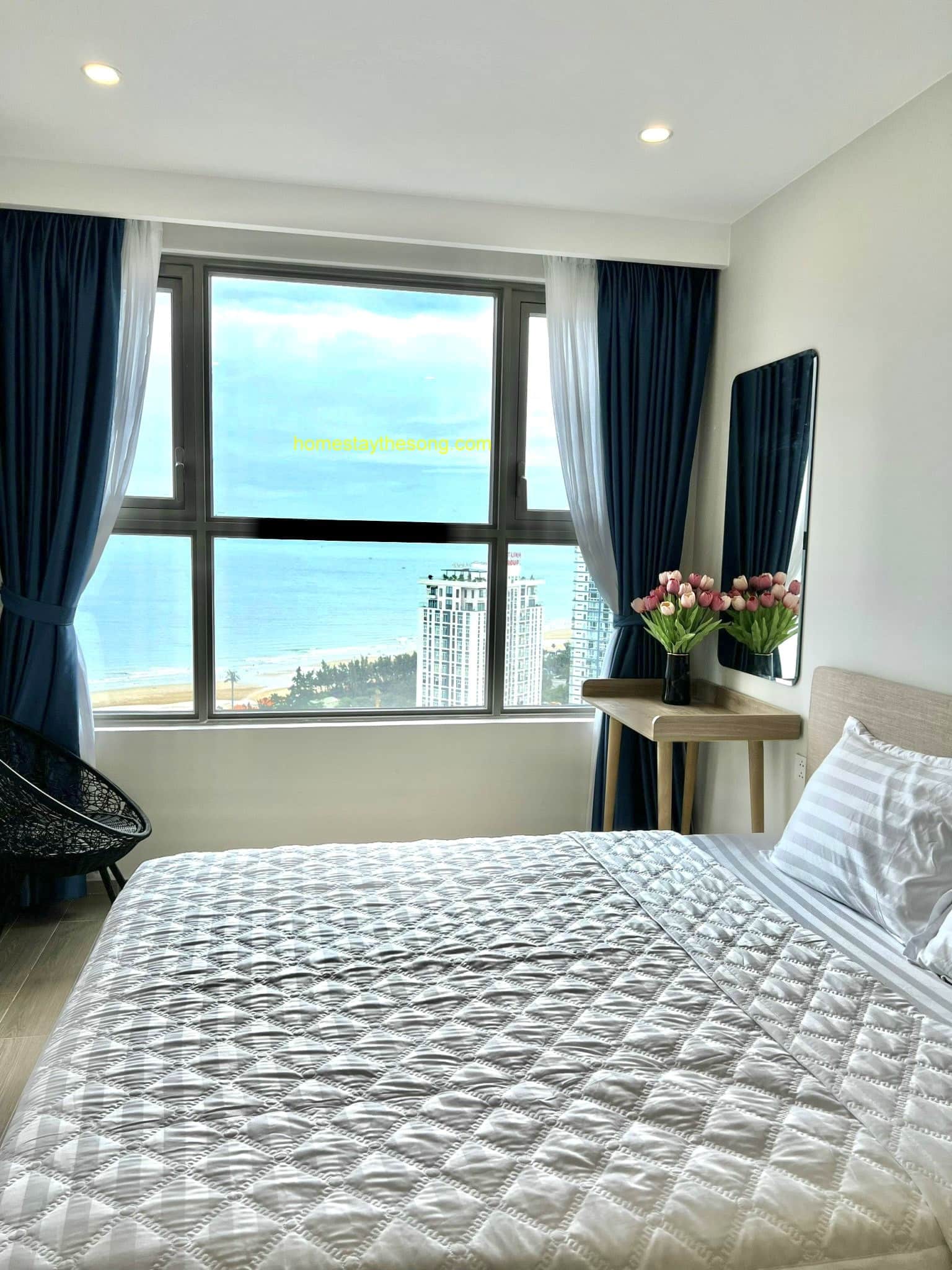 Homestay The Sóng trân trọng giới thiệu căn hộ 25.25 – một căn hộ đẹp và sang trọng với 2 phòng ngủ, tầng cao 25 và view biển trực diện. Căn hộ này cũng được trang bị nệm thêm và sofabed, cho phép tối đa 8 người lưu trú.