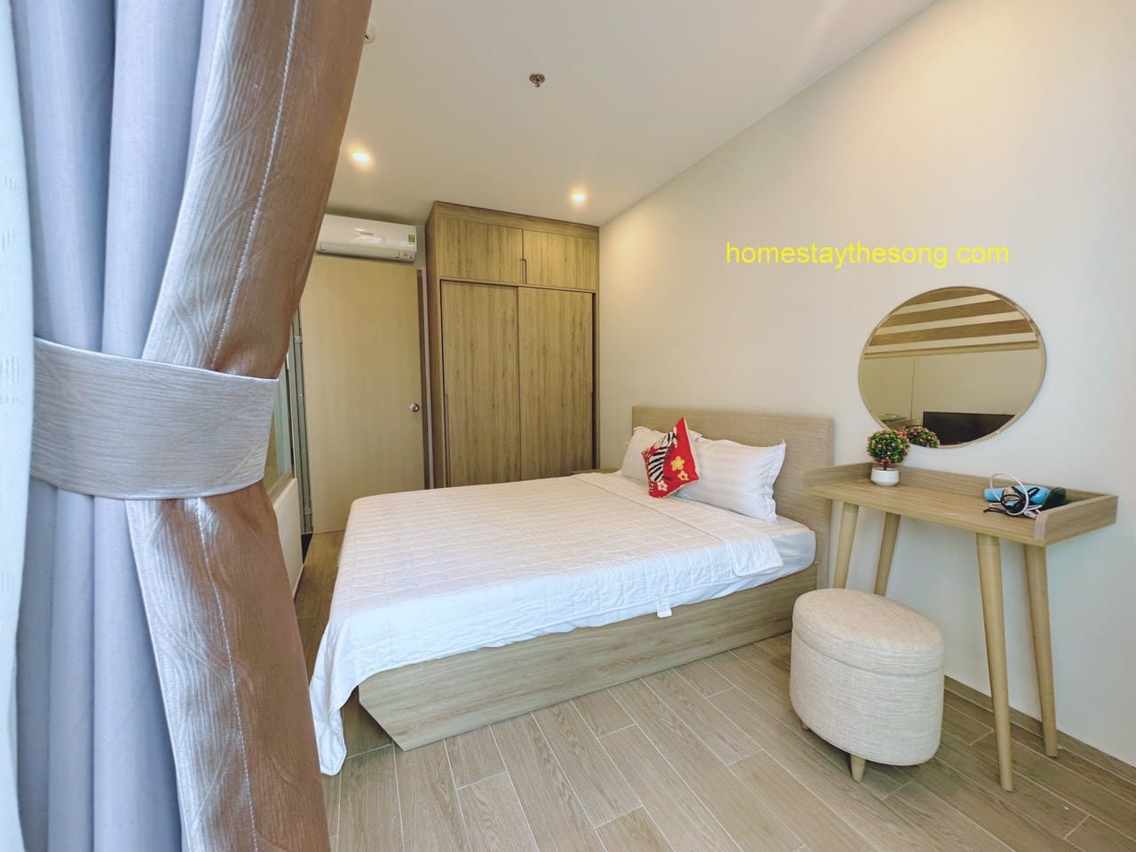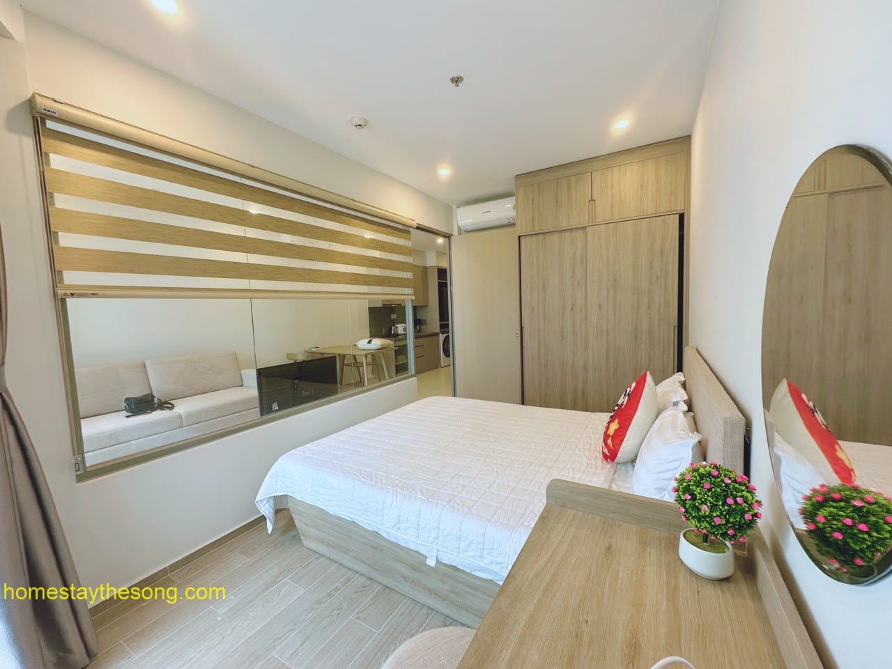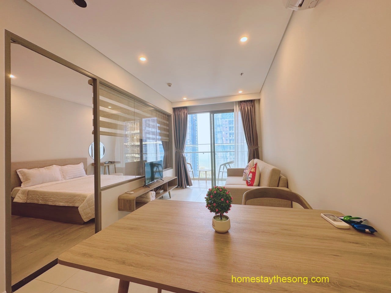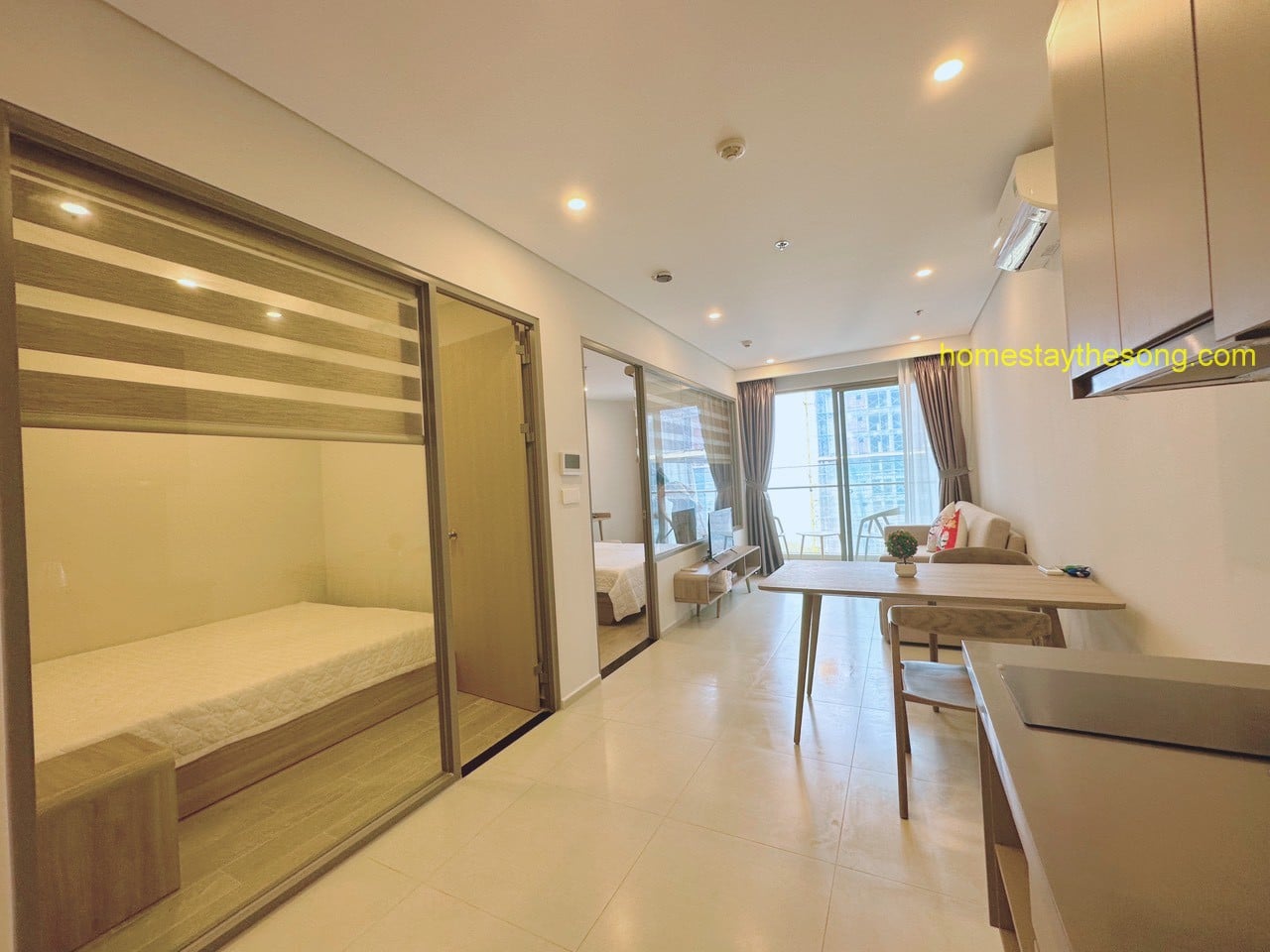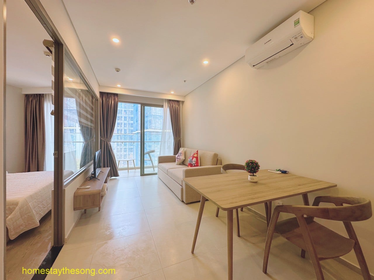 - Loại giường: Có 1 giường 1,8x2m hoặc 1,6x2m, 1 giường 1,6x2m hoặc 1,4x2m, và sofa bed 1.4x2m (có nệm thêm nếu cần).