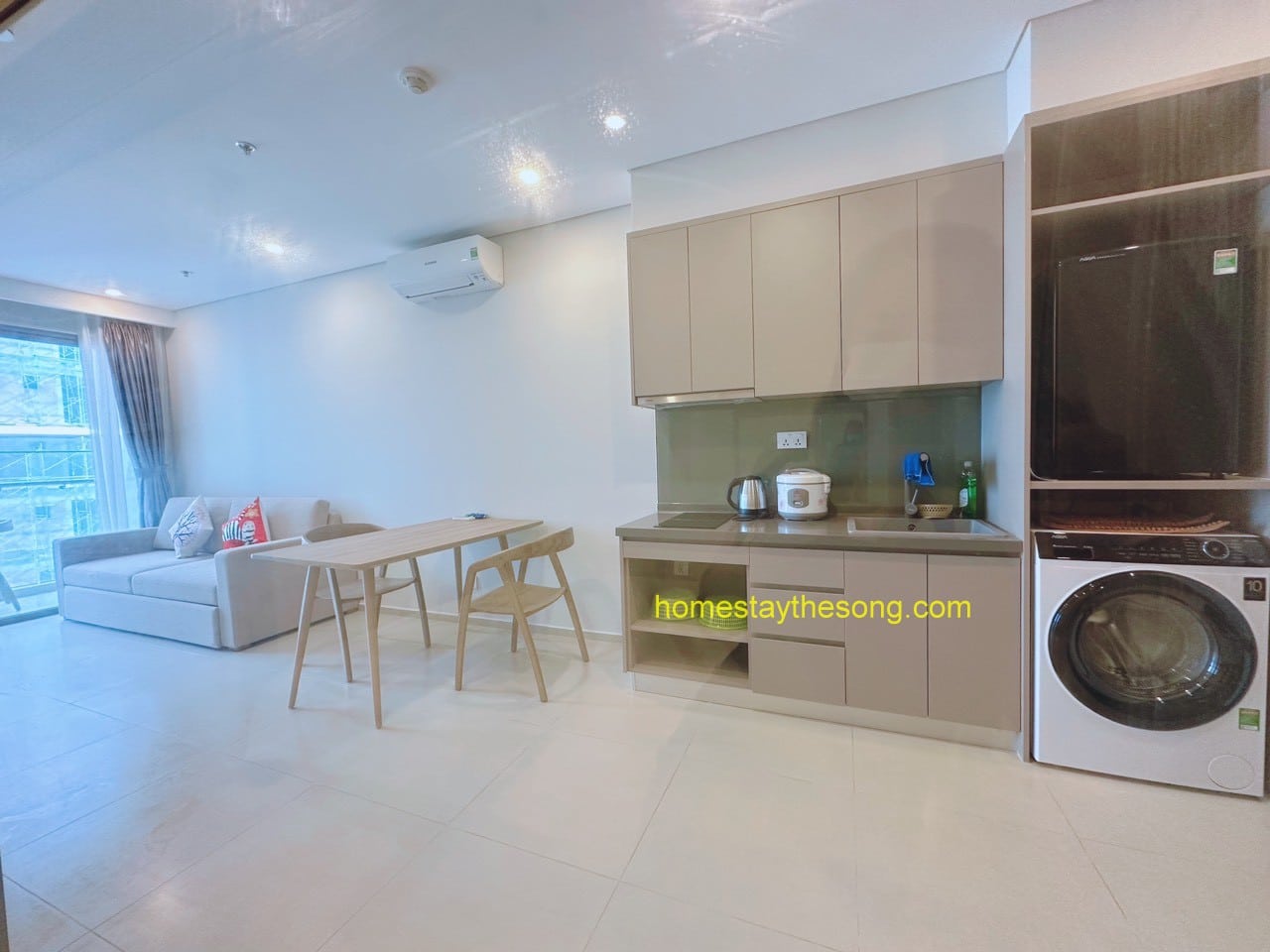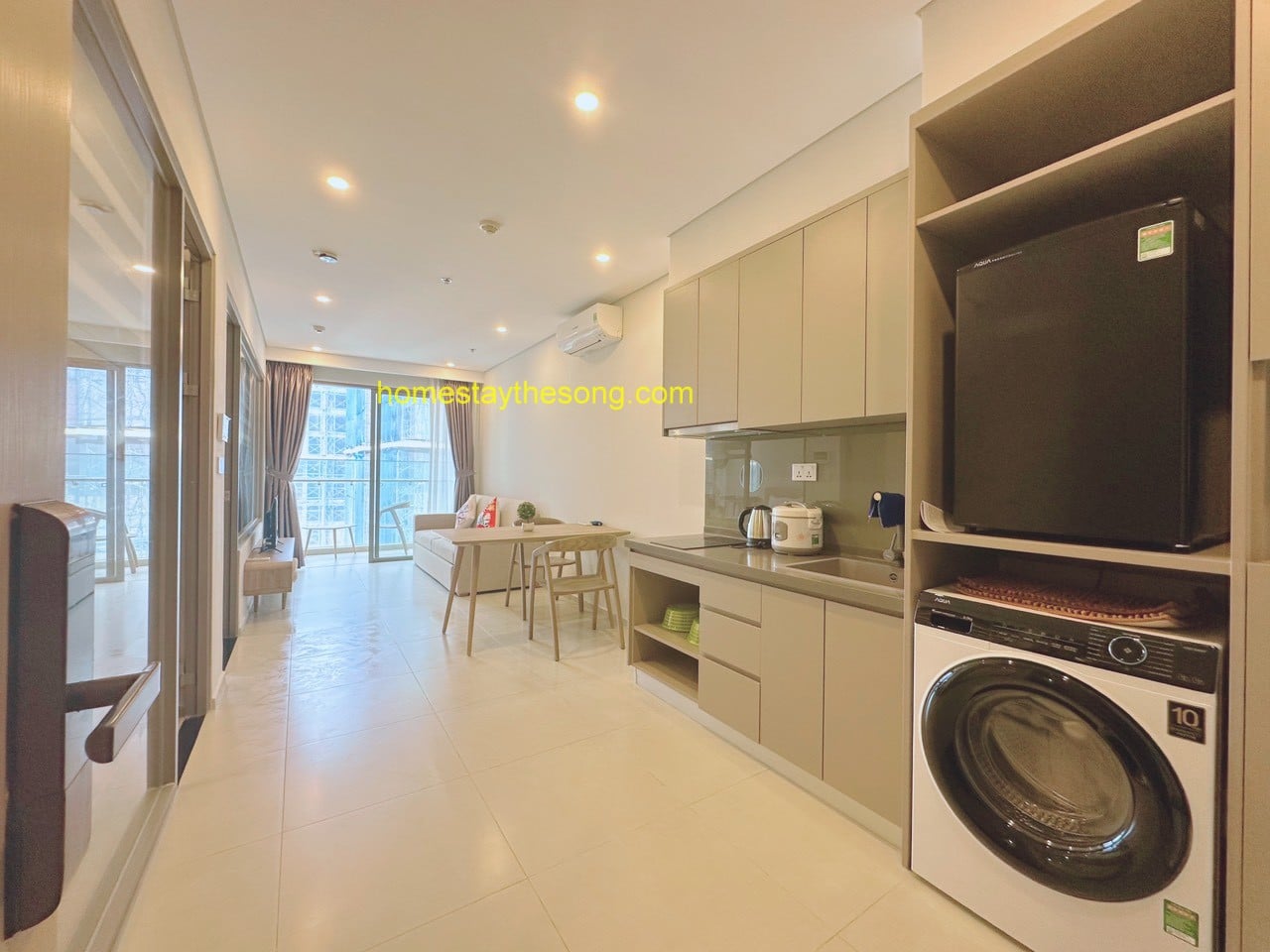 - Căn hộ được trang bị đầy đủ nội thất và tiện nghi như máy lạnh, máy giặt, máy nước nóng, máy sấy tóc, quạt máy, Tivi Smart Home, Wifi cáp quang, truyền hình cáp, dầu gội, sữa tắm, khăn tắm, kem đánh răng, và quạt máy. Có ban công nhìn ra bên ngoài để bạn có thể thư giãn.
