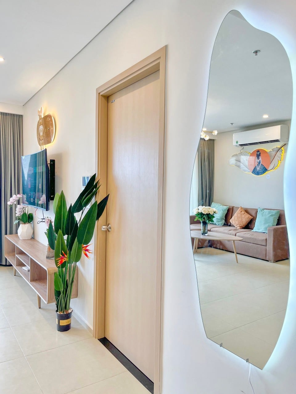 - Căn hộ được trang bị đầy đủ nội thất và tiện nghi như máy lạnh, máy giặt, máy nước nóng, máy sấy tóc, quạt máy, Tivi Smart Home, Wifi cáp quang, truyền hình cáp, dầu gội, sữa tắm, khăn tắm, kem đánh răng, và quạt máy. Có ban công nhìn ra bên ngoài.