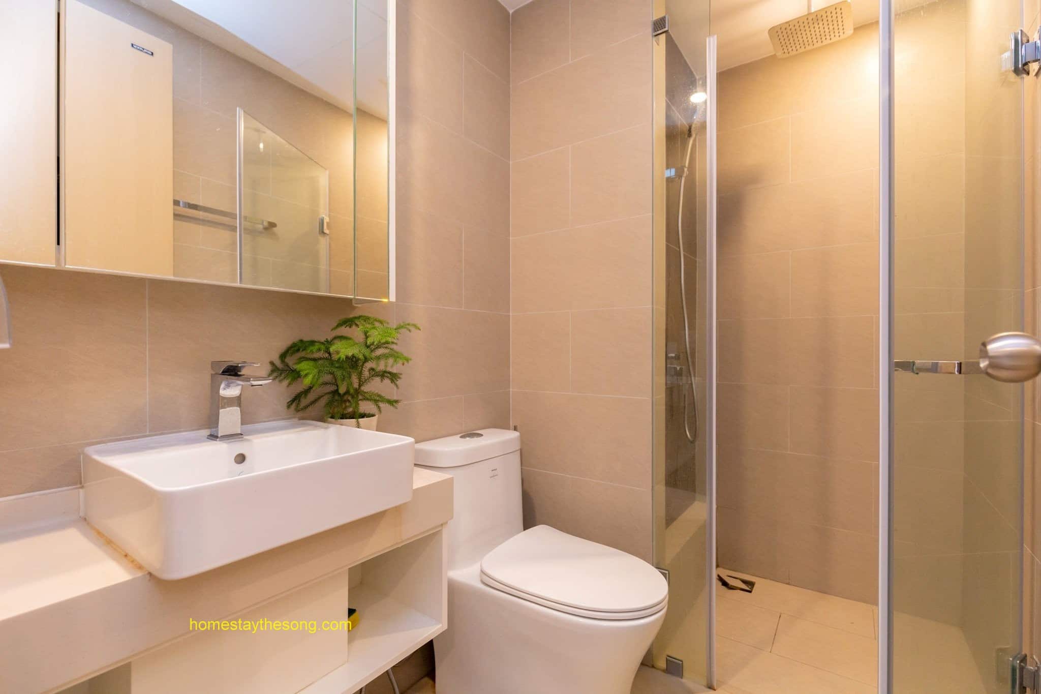 Tiện ích khác: Homestay The Sóng cung cấp các tiện ích khác như phòng tắm riêng với thiết bị vệ sinh, ti vi để giải trí và máy giặt để phục vụ nhu cầu giặt là của du khách.