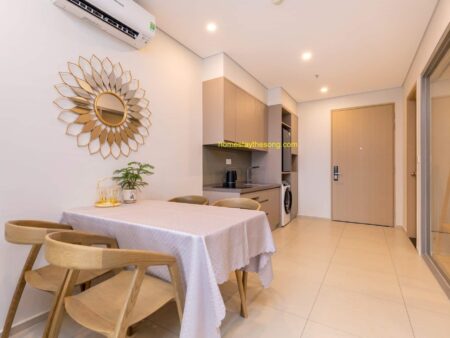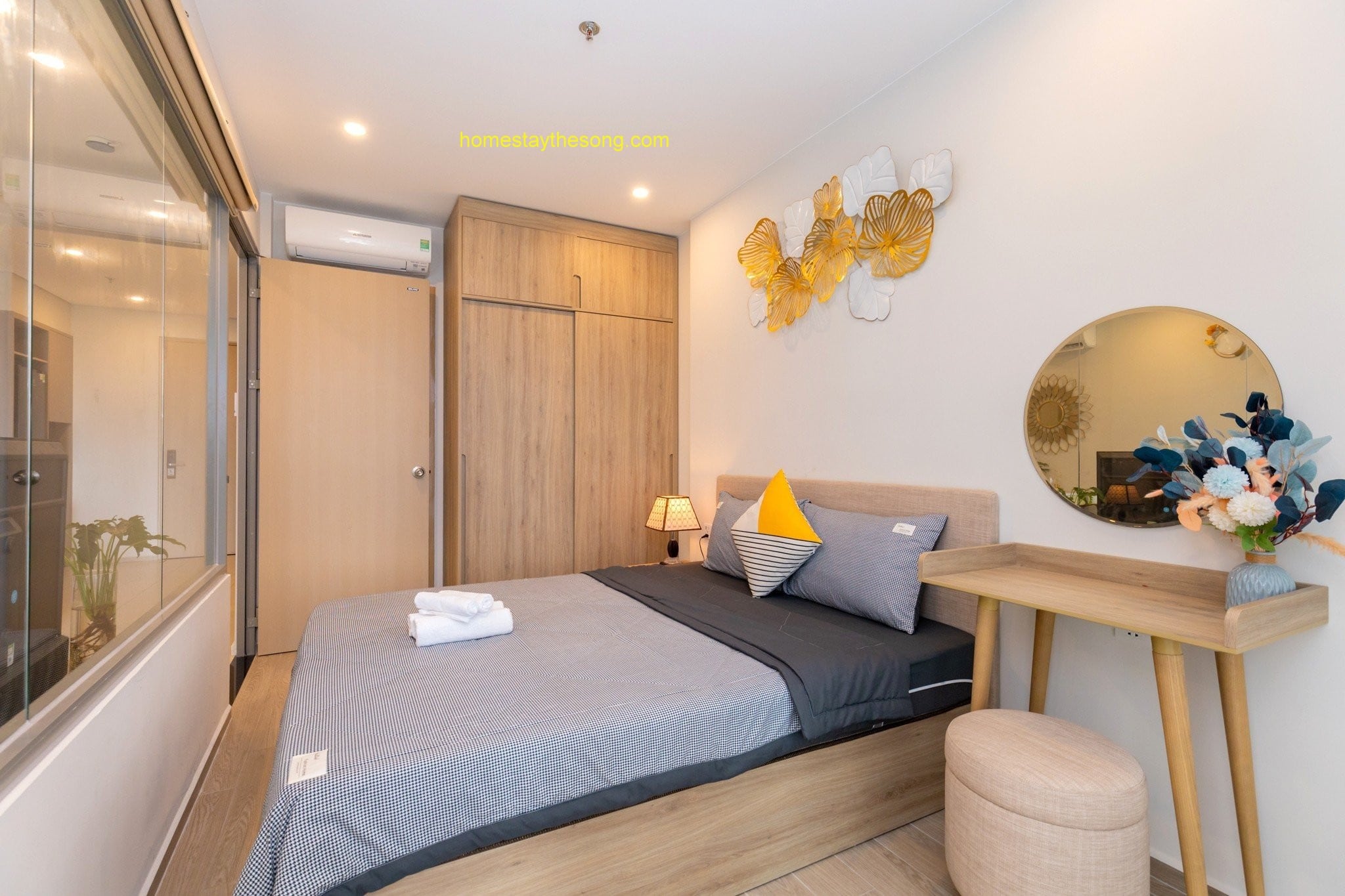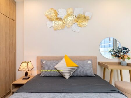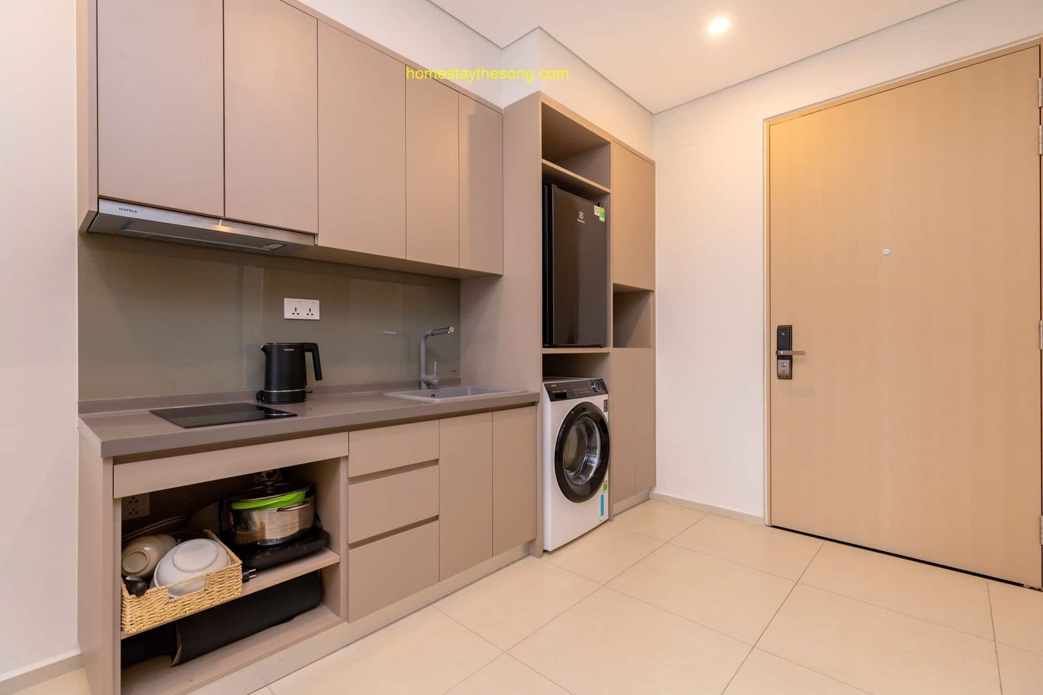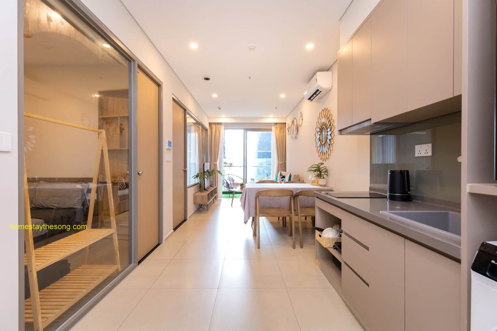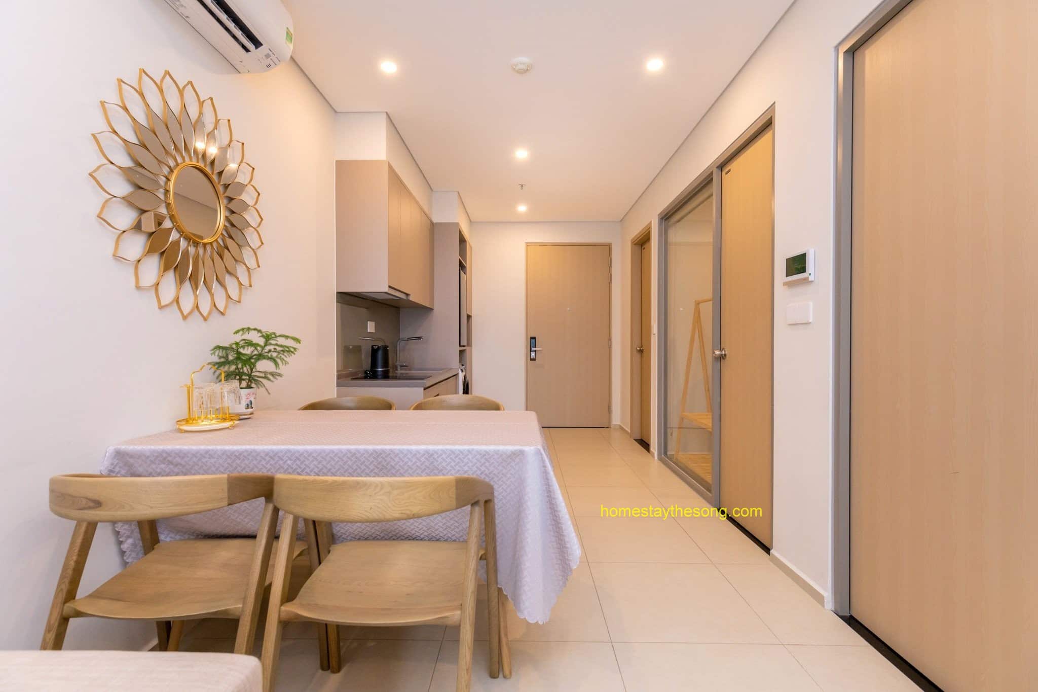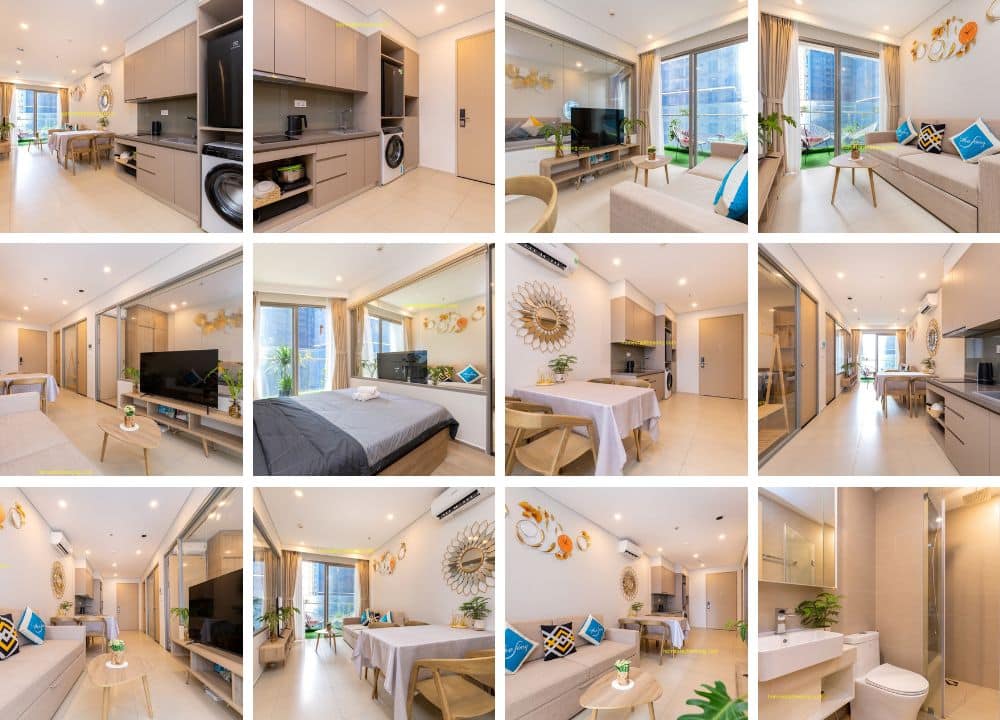 Nội thất: Homestay được trang bị nội thất sang trọng và cao cấp, tạo nên một không gian sống thoải mái và ấm cúng. Căn hộ 9.12A có các tiện nghi cơ bản như bếp điện, máy hút mùi, máy sấy, đồ nấu ăn, tủ quần áo, bàn trang điểm, tủ giày và nệm thêm. Ngoài ra, còn có các tiện ích như khăn tắm, xà bông tắm, tủ lạnh và máy giặt để đáp ứng nhu cầu của du khách.