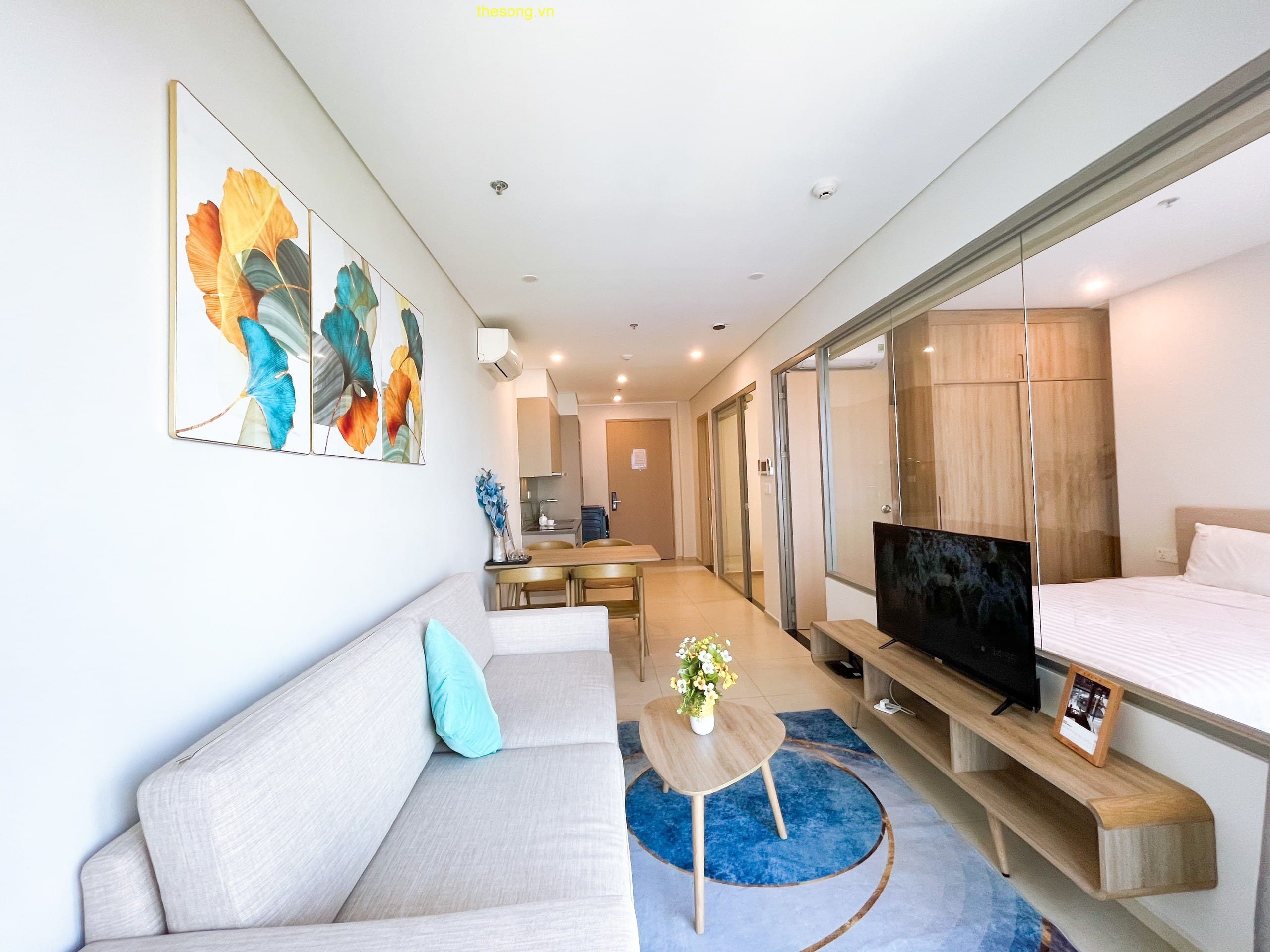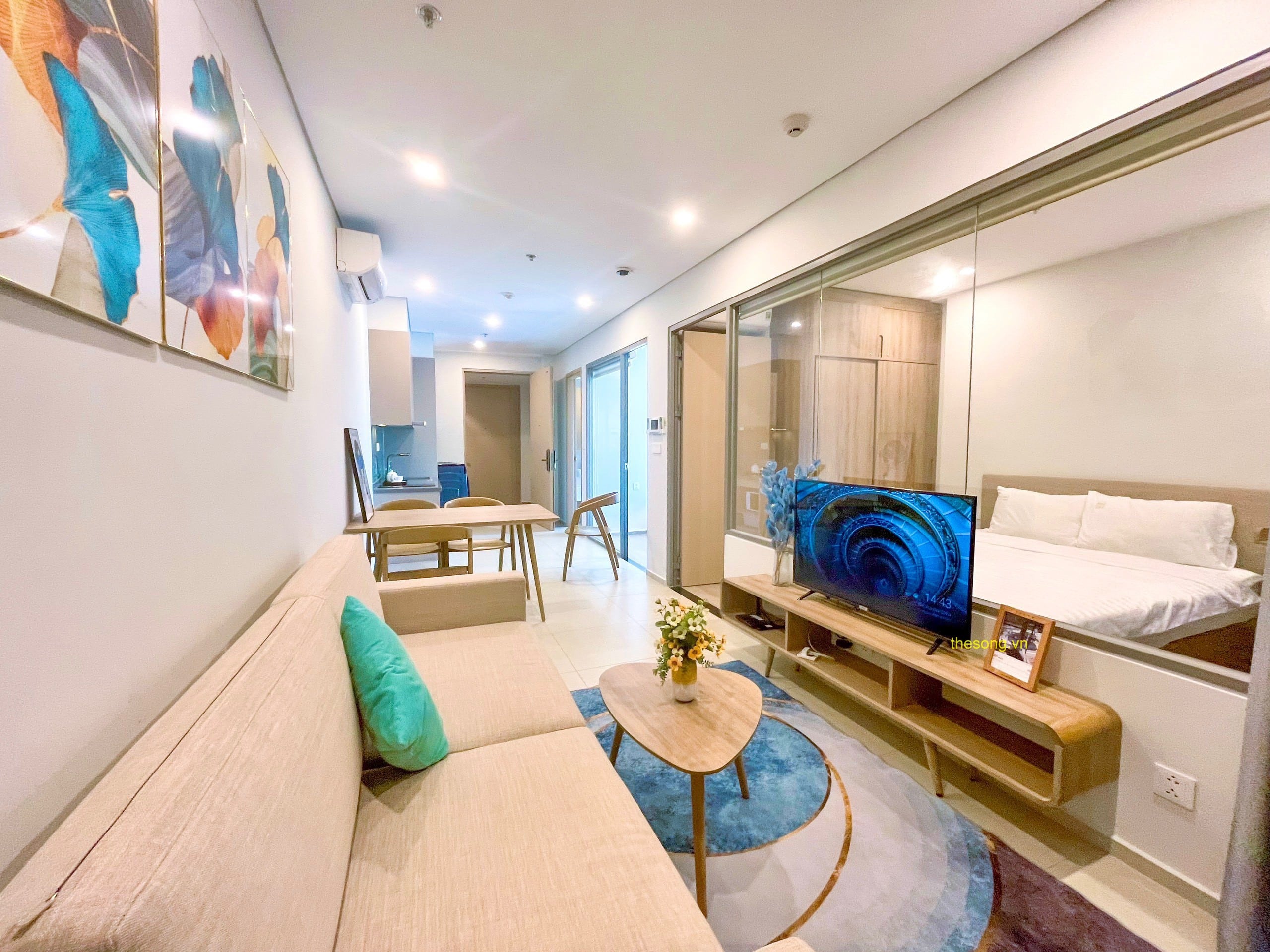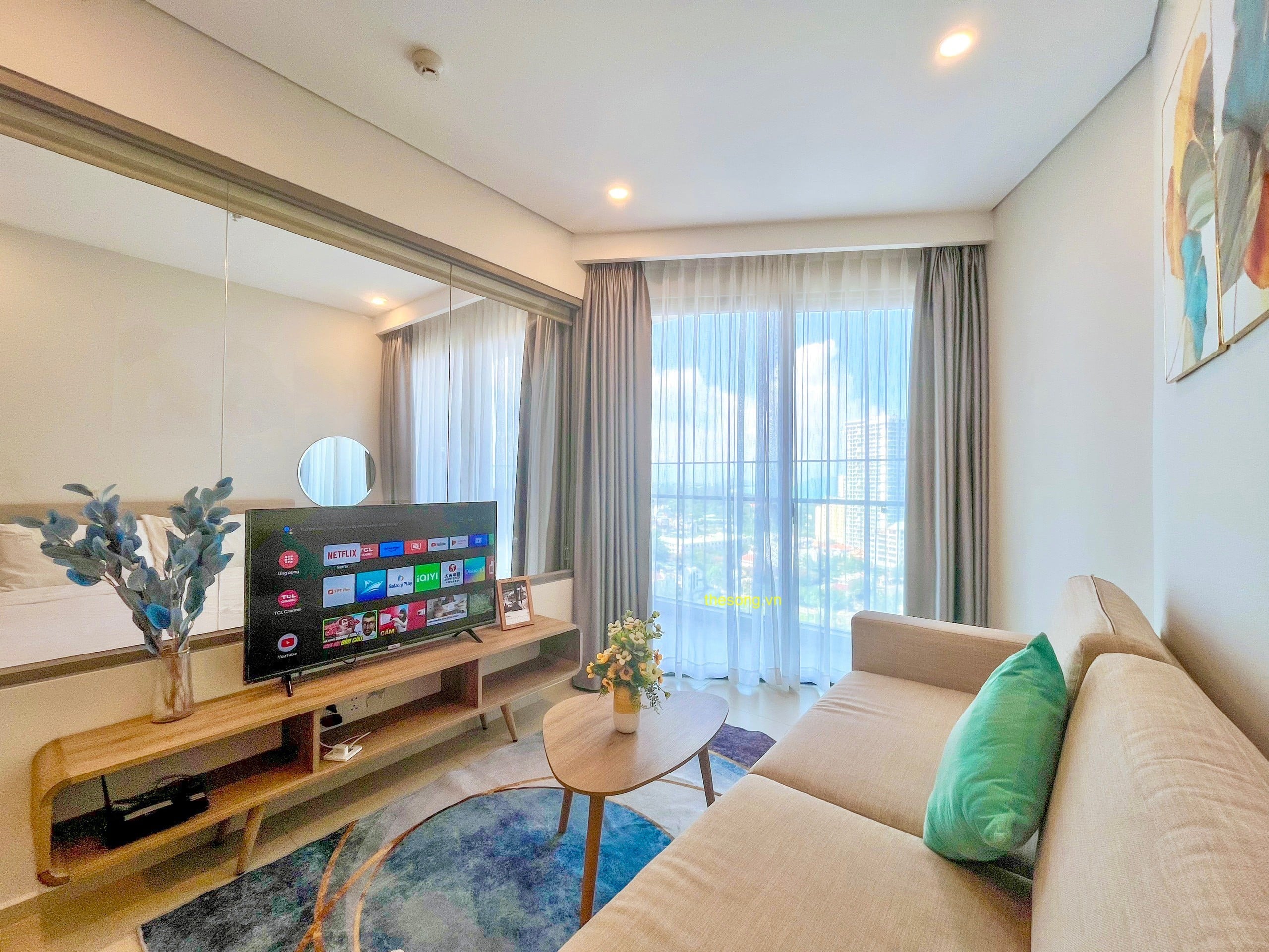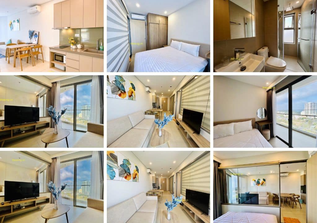 Căn hộ được trang bị đầy đủ nội thất như: máy lạnh, máy giặt, máy nước nóng, máy sấy tóc, quạt máy, Tivi Smart Home, Wifi cáp quang, truyền hình cáp. Ngoài ra, còn cung cấp các tiện ích như dầu gội, khăn tắm, kem đánh răng, quạt máy và có ban công nhìn ra bên ngoài.