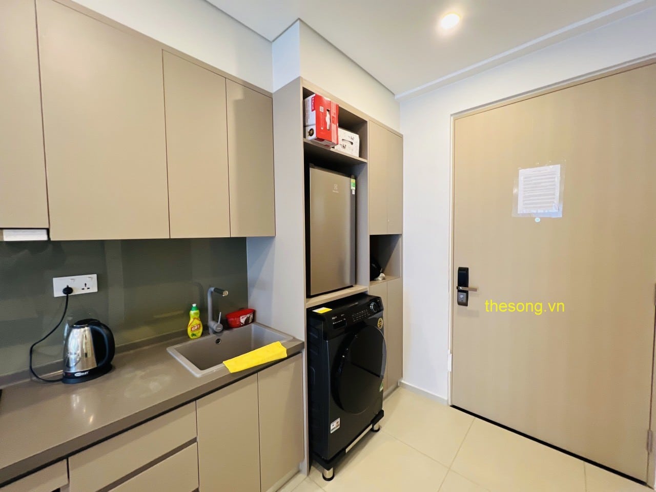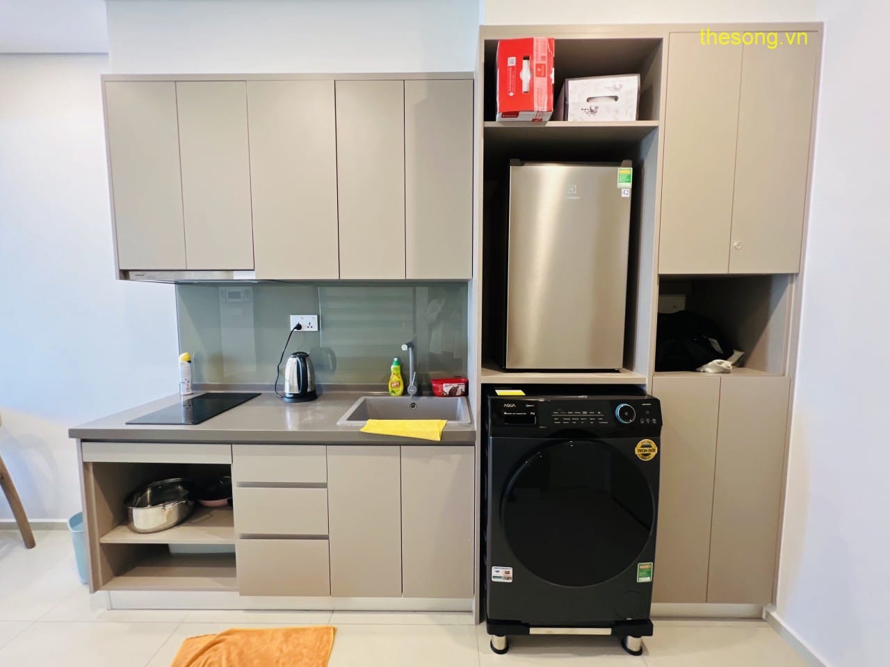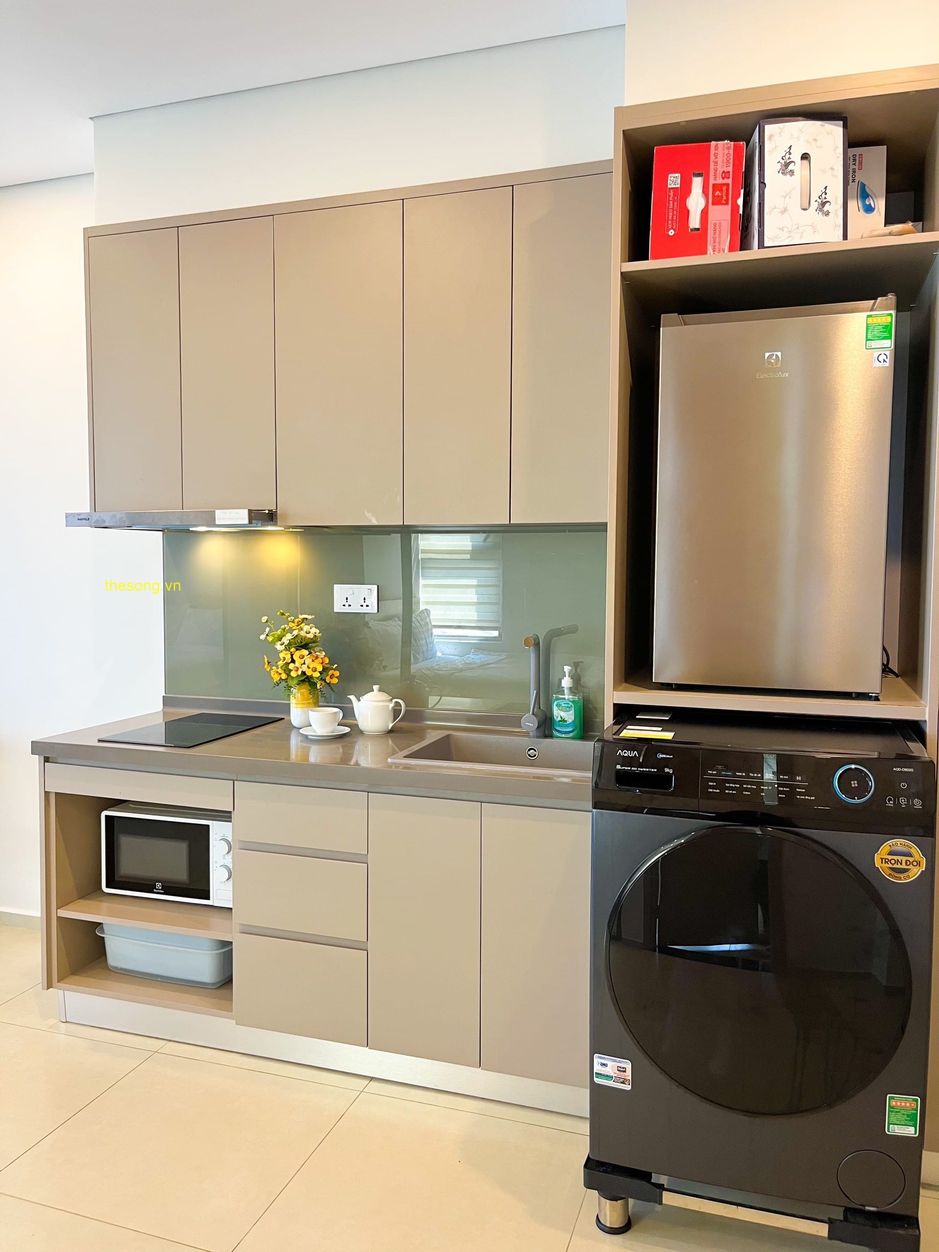 Bếp trong căn hộ được trang bị đầy đủ thiết bị nấu ăn, bao gồm: Bếp điện từ, dụng cụ nấu ăn, nồi cơm điện, máy hút khói, lò vi sóng, ấm siêu tốc và các gia vị nấu ăn khác.