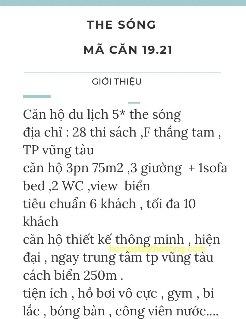 Căn hộ 19.21 The Sóng là một sự lựa chọn thuê căn hộ đẹp và ấn tượng. Với diện tích rộng rãi, view biển trực diện và tiện nghi đầy đủ, đây là một nơi lý tưởng để thư giãn và tận hưởng kỳ nghỉ của bạn tại Vũng Tàu.