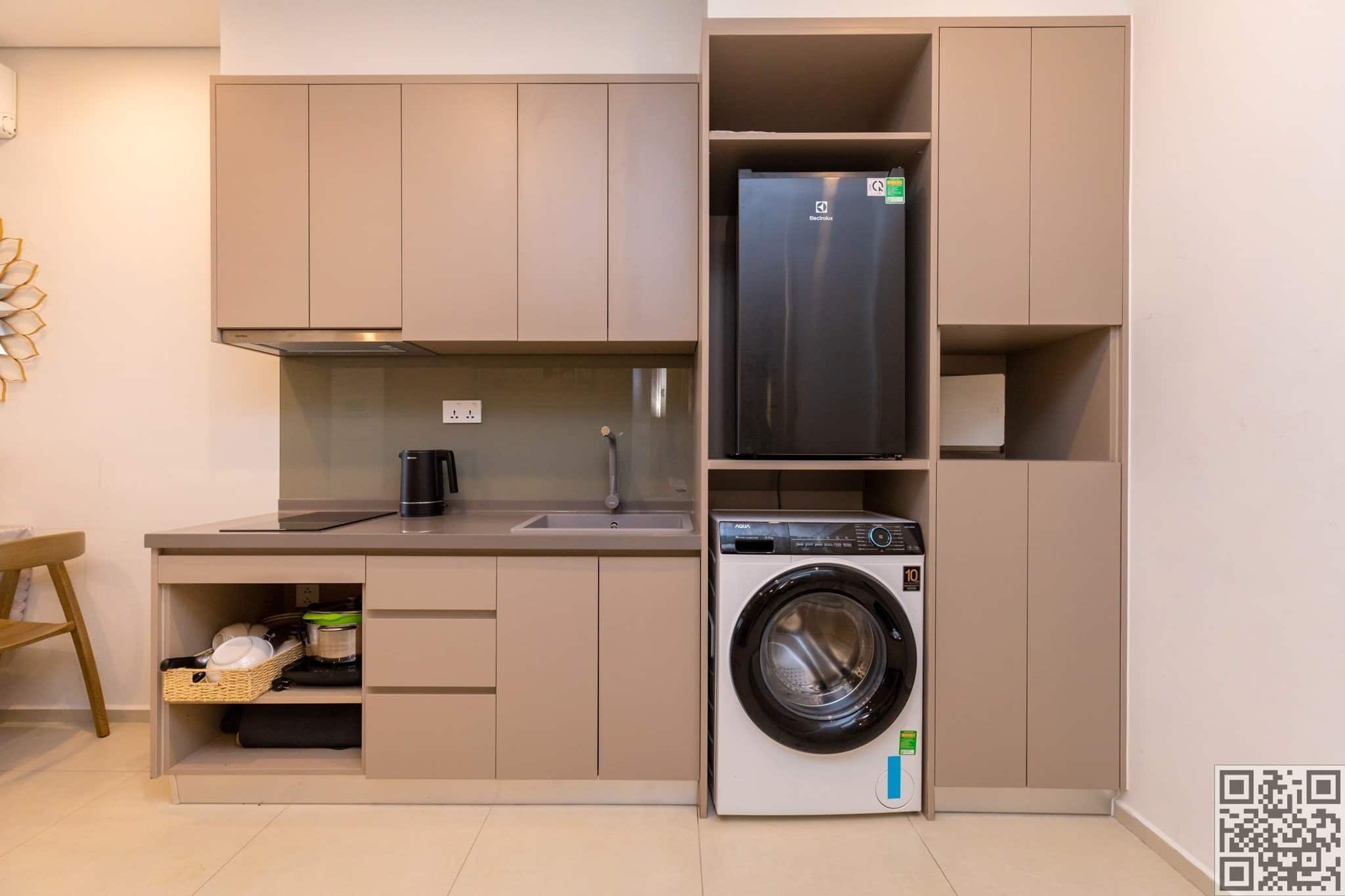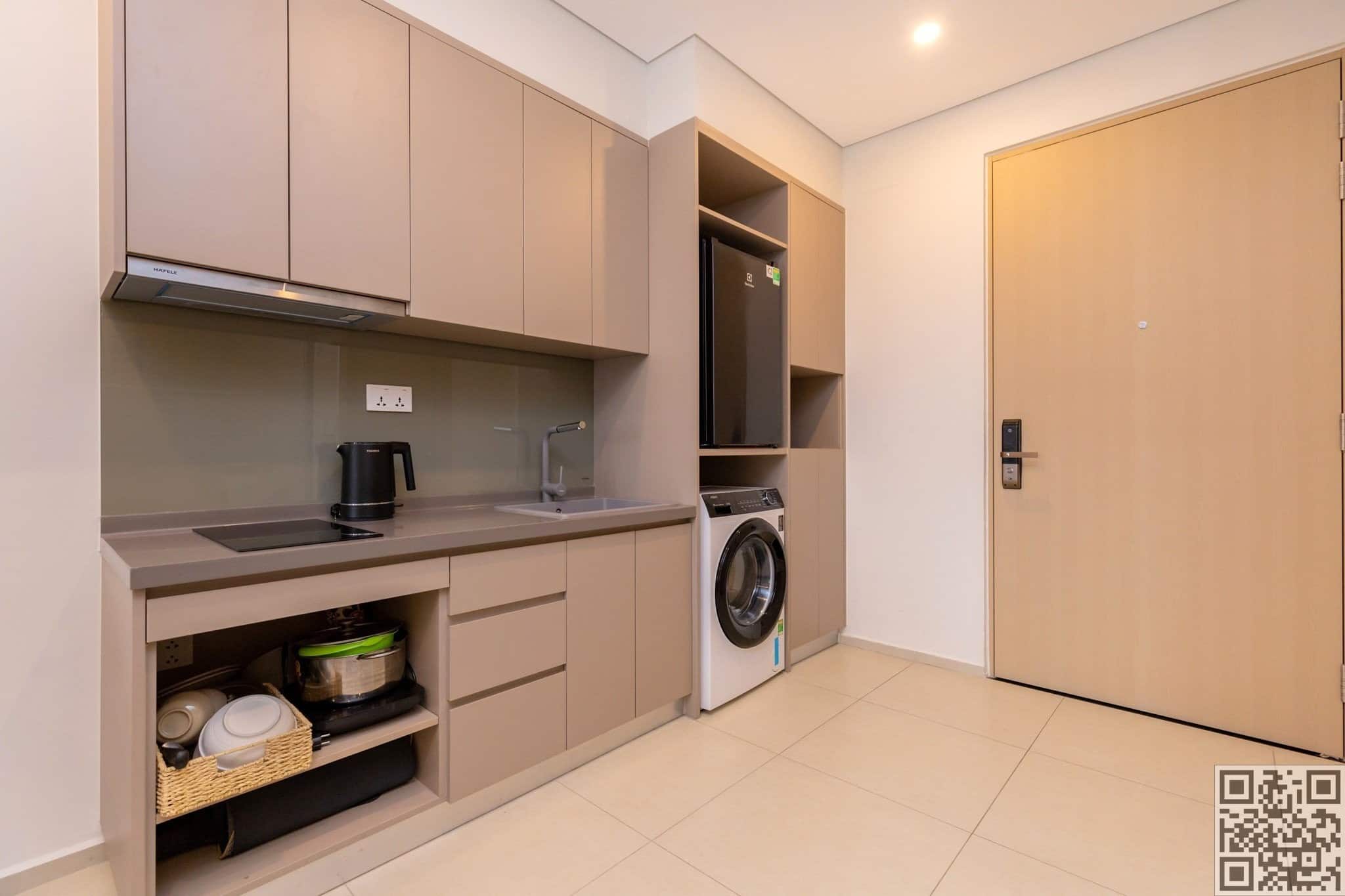 - Phòng bếp đầy đủ với bếp điện từ, dụng cụ nấu ăn, nồi cơm điện, máy hút khói, lò vi sóng, ấm siêu tốc, gia vị nấu ăn và bình siêu tốc.